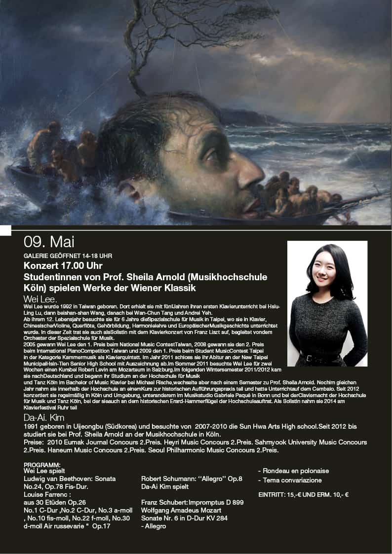 Wei Lee spielt Ludwig van Beethoven: Sonata No.24, Op.78 Fis-Dur. Louise Farrenc : aus 30 Etüden Op.26   No.1 C-Dur , No.2 C-Dur, No.3 a-moll , No.10 fis-moll, No.22 f-moll, No.30 d-moll Air russe varie ” Op.17   Robert Schumann: ‘ ‘ Allegro” Op.8   Da-Ai Kim spielt   Franz Schubert: Impromptus D 899   Wolfgang Amadeus Mozart Sonate Nr. 6 in D-Dur KV 284