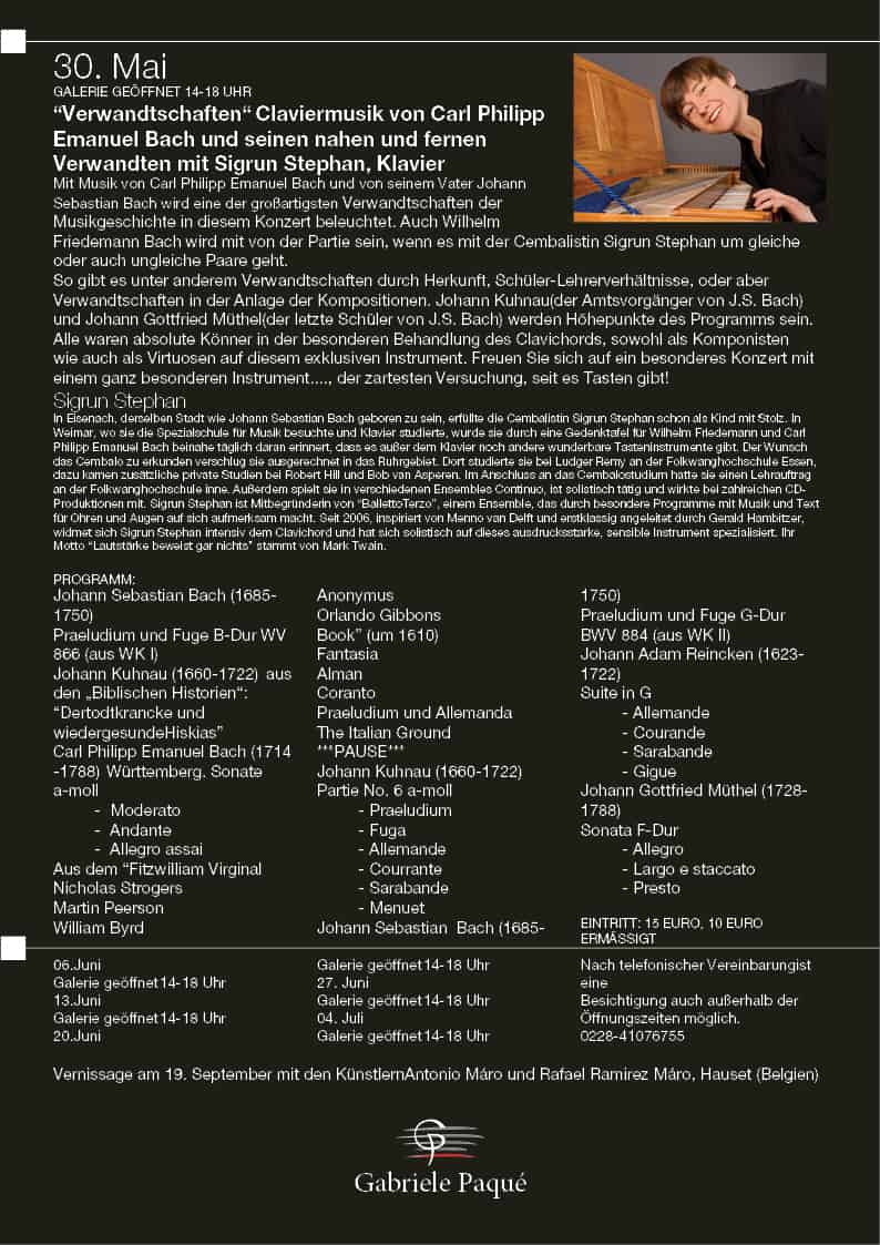 Mit Musik von Carl Philipp Emanuel Bach und von seinem Vater Johann Sebastian Bach wird eine der großartigsten Verwandtschaften der Musikgeschichte in diesem Konzert beleuchtet. Auch Wilhelm Friedemann Bach wird mit von der Partie sein, wenn es mit der Cembalistin Sigrun Stephan um gleiche oder auch ungleiche Paare geht. So gibt es unter anderem Verwandtschaften durch Herkunft, Schüler-Lehrerverhältnisse, oder aber Verwandtschaften in der Anlage der Kompositionen. Johann Kuhnau (der Amtsvorgänger von J.S. Bach) und Johann Gottfried Müthel (der letzte Schüler von J.S. Bach) werden Höhepunkte des Programms sein. Alle waren absolute Könner in der besonderen Behandlung des Clavichords, sowohl als Komponisten wie auch als Virtuosen auf diesem exklusiven Instrument. Freuen Sie sich auf ein besonderes Konzert mit einem ganz besonderen Instrument…., der zartesten Versuchung, seit es Tasten gibt!